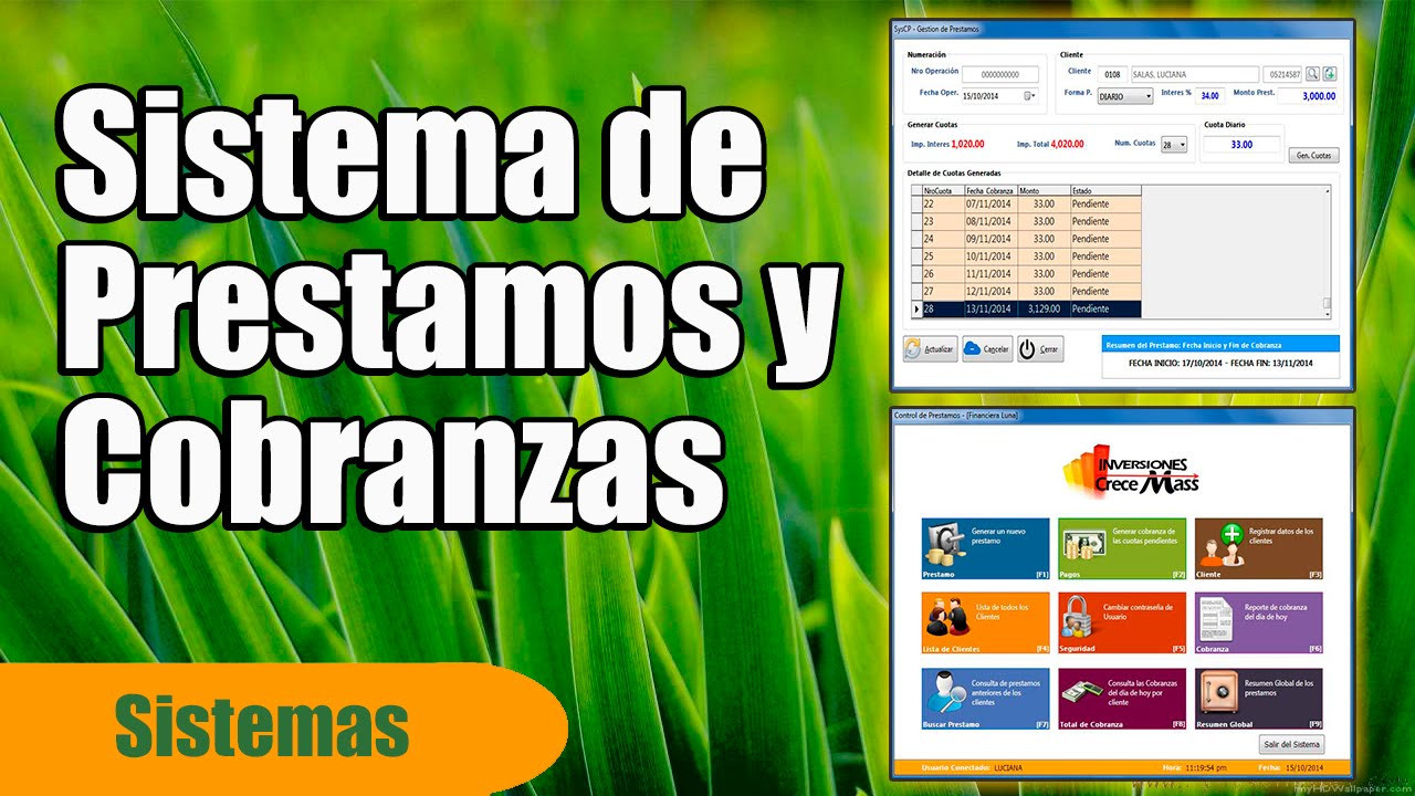 Sistema de préstamo y cobranzas Pagos Resumen de deudas Liquidación de deudores Prestamos bajo intereses Calculo de intereses, diario, semanal quincenal, mensual Clientes en mora